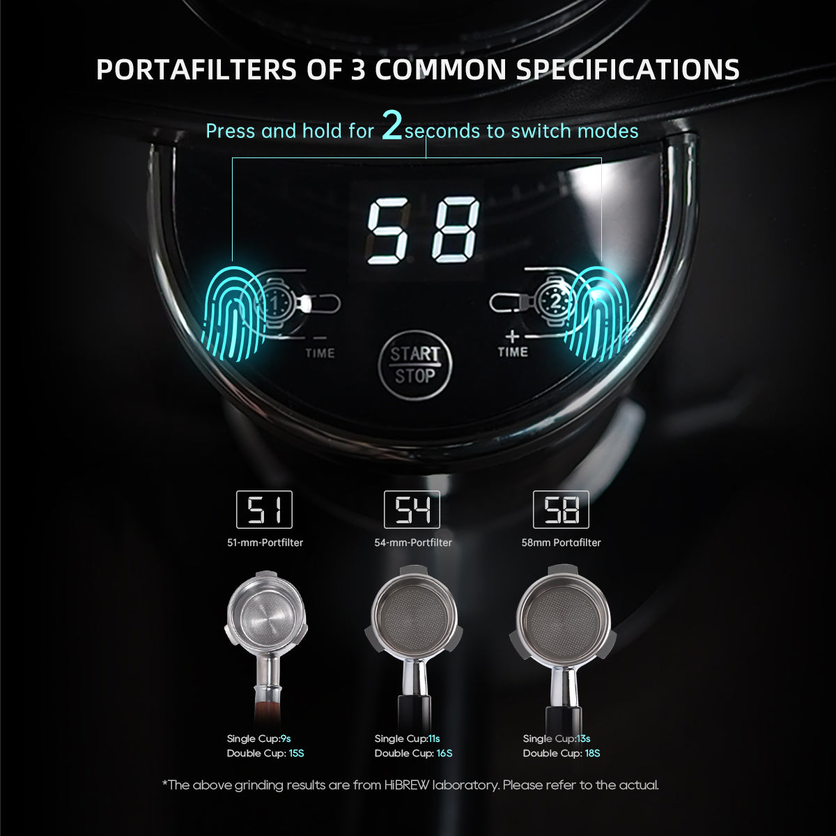 grinder compatible with 51mm, 54mm, and 58mm espresso portafilters.