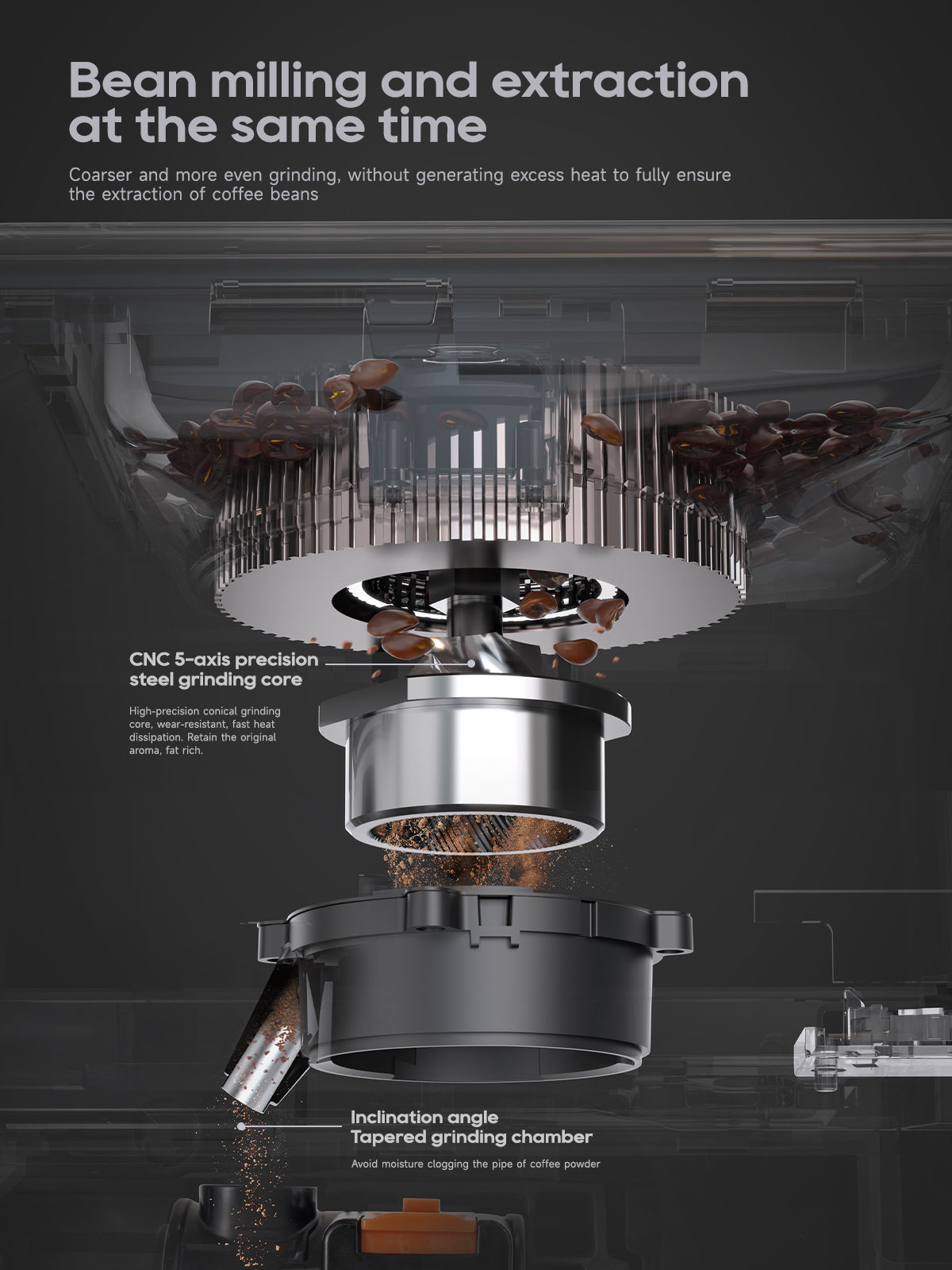 The tapered grinding chamber minimizes heat buildup and prevents clogs, preserving the coffee's natural aroma for a truly rich experience.