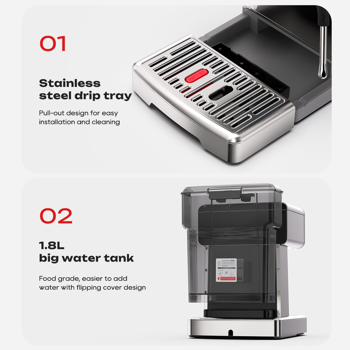 • Water Tank Capacity: 1.8L
