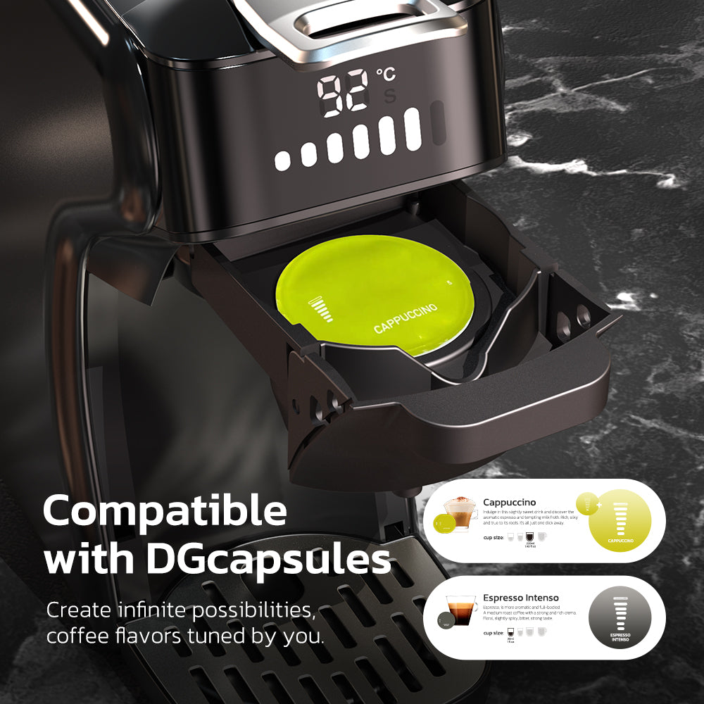 Works with DG/NS Capsules, K-Cups, Ground Coffee & Tea!